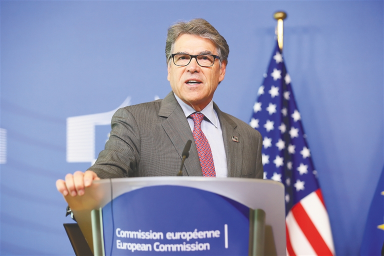 这是时任美国能源部长的里克·佩里在比利时布鲁塞尔出席记者会的资料照片(2019年5月2日摄)。 新华社记者 郑焕松 摄
