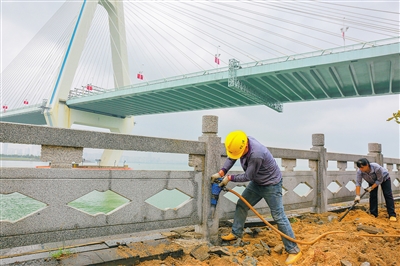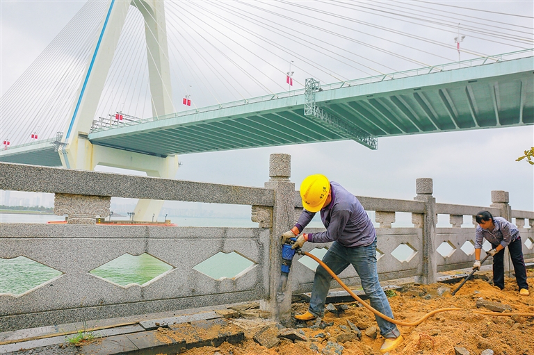 10月17日,海口湾畅通工程美兰区段多个工作面展开初步作业,工人忙碌施工。本报记者 李天平 摄