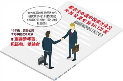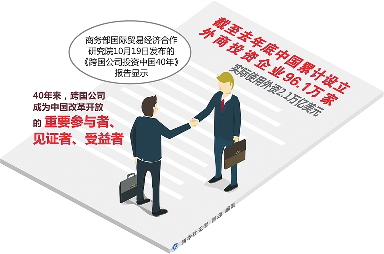 在中国改革开放40多年的历史进程中,跨国公司作为重要参与者、见证者、受益者发挥了积极作用。中国改革开放伊始,包括跨国公司在内的境外企业就开始进入中国进行投资经营。北京航空食品公司、天津奥的斯电梯公司、上海大众汽车公司等第一批跨国公司投资项目如今已成人们耳熟能详的知名品牌,跨国公司所带来的产品与服务已深入中国百姓生活的方方面面。