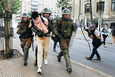 10月18日,在智利圣地亚哥,防暴警察带走一名示威者。