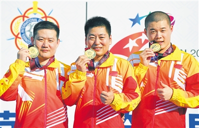 当天上午开始的比赛竞争激烈。第一组比赛,中国队老将谢振翔发挥稳定,法国选手位居小组第一。第二组比赛开始后,金泳德稳扎稳打获583环,但乌克兰选手表现突出,在8秒速射中仅丢一分。第三组鸣枪开赛,“95后”小将姚兆楠发挥神勇,在前10发中打出97环的好成绩。此时,现场大屏幕第一次出现实时总成绩排名,排名前几位微小的总分差距令现场气氛陡然升温。接下来排位前三名的总成绩始终没有拉开差距。最终,由谢振翔、金泳德、姚兆楠组成的中国队以1747环的总成绩斩获本届世界军人运动会首金。