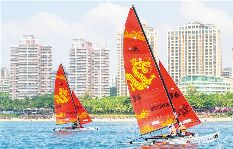 10月19日,第三届2019三亚“大东海杯”·Hobie16帆船邀请赛在三亚大东海旅游风景区扬帆起航。来自中国、美国、英国等国家和地区的38支队伍共近百名选手将开展为期两天的海上竞逐。赛事设Hobie16帆船练习赛、大师赛、家庭赛等专业赛事,还有水鼓舞、啦啦操等系列活动,让市民游客体验水上运动乐趣,助力三亚举办2020年第六届亚洲沙滩运动会。