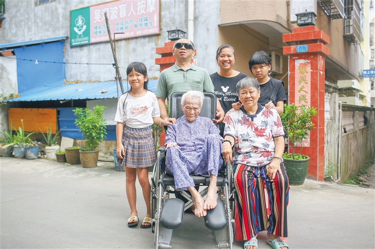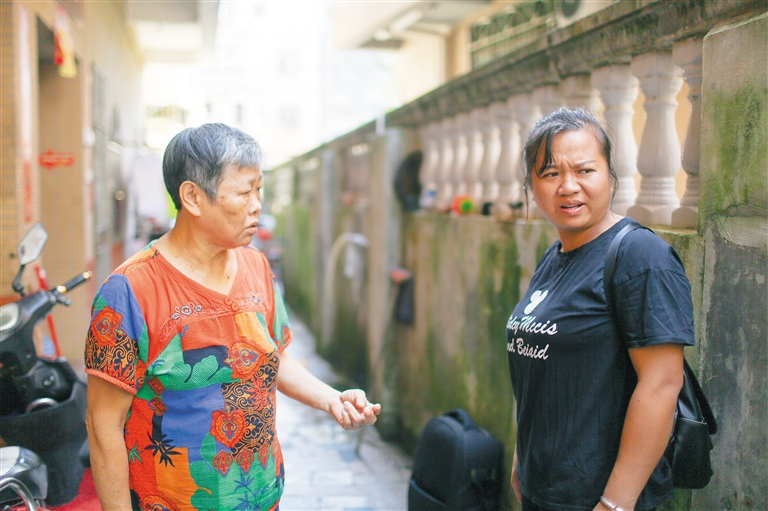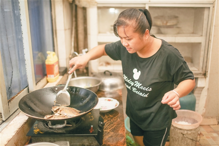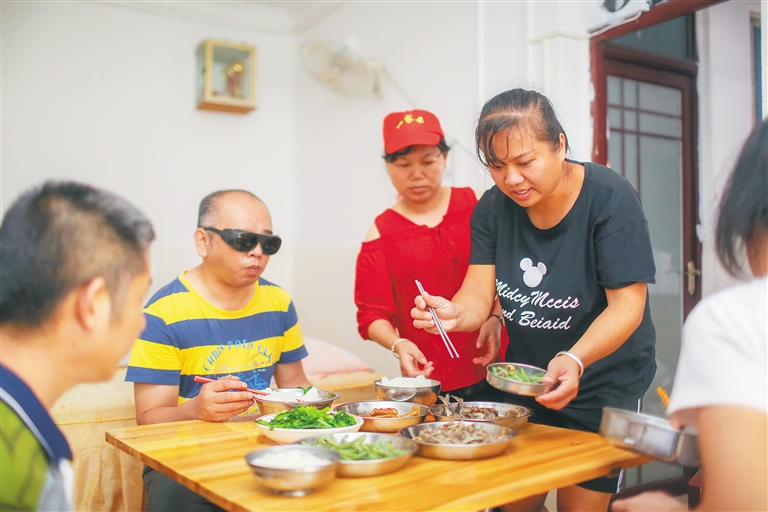 临近中午,吴海波从位于琼山区凤翔东路的家坐公交车去龙昆南路金竹园小区的按摩店,为丈夫符勇准备午餐。每周,符勇会回家与妻子、孩子团聚一次,其余时间都是吴海波来回两头奔波,在家照顾老人和孩子的饮食起居,时不时照顾丈夫符勇的生活。