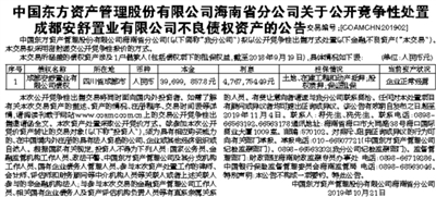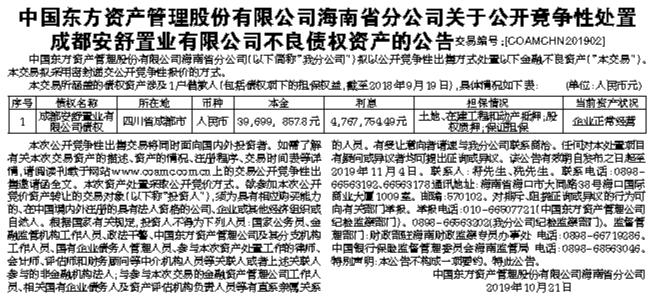 中国东方资产管理股份有限公司海南省分公司关于公开竞争性处置成都安舒置业有限公司不良债权资产的公告