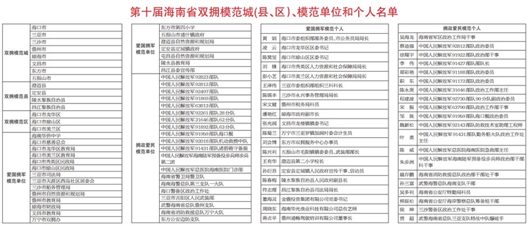 第十届海南省双拥模范城(县、区)、模范单位和个人名单