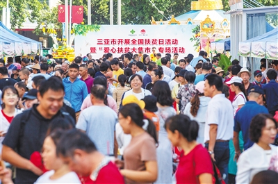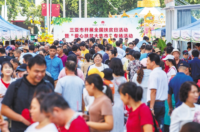 近日,三亚爱心扶贫大集市专场活动在该市乐天城广场开展,吸引了众多市民游客前来选购扶贫农产品。全市各区的相关产业合作社、贫困户共携100多种农产品到场展销,当天销售金额达21.58万元,受益贫困村民293人。 本报记者 武威 摄