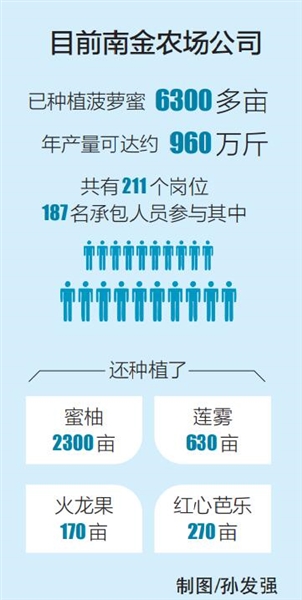 据统计,目前南金农场公司已种植菠萝蜜6300多亩,年产量可达约960万斤,共有211个岗位、187名承包人员参与其中。同时,该公司种植了蜜柚2300亩、莲雾630亩、火龙果170亩、红心芭乐270亩……热带水果种植规模效益已初步显现,并带动地方和农场百余户贫困户脱贫。