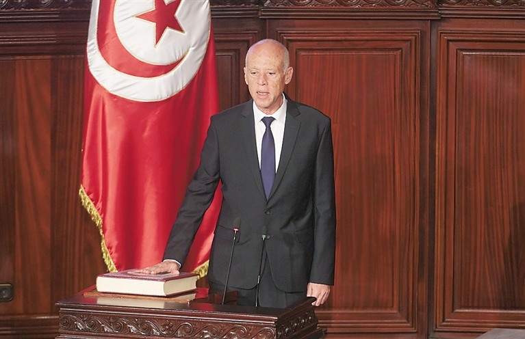 10月23日,在突尼斯首都突尼斯市,突尼斯当选总统凯斯·赛义德在国民代表大会宣誓就职。