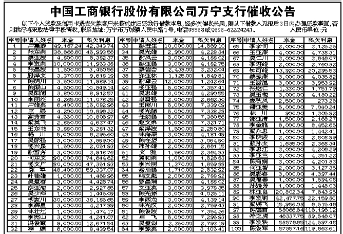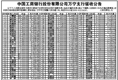 中国工商银行股份有限公司万宁支行催收公告