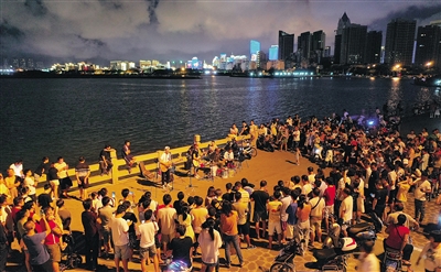 21时许,外滩的酒吧也逐渐满座。市民程昱和朋友一起来到漫道边的音乐酒吧,点了几杯啤酒坐着聊天。“外滩的酒吧更有特色,坐在海边看着大海吹着海风再喝点小酒,别提有多舒服了。”