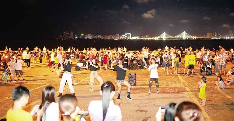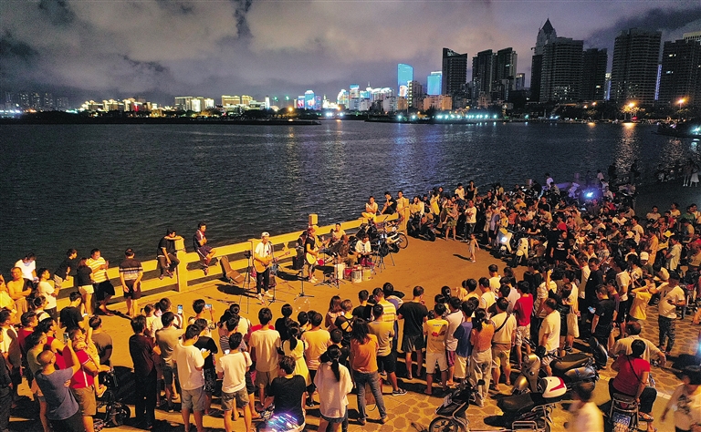 海水、漫步道、酒吧、音乐……海口龙华区渡海路外滩中心海口湾每个时刻都有着不同的热闹。