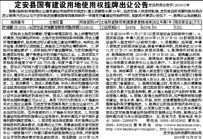 琼海市自然资源和规划局国有建设用地使用权挂牌出让公告