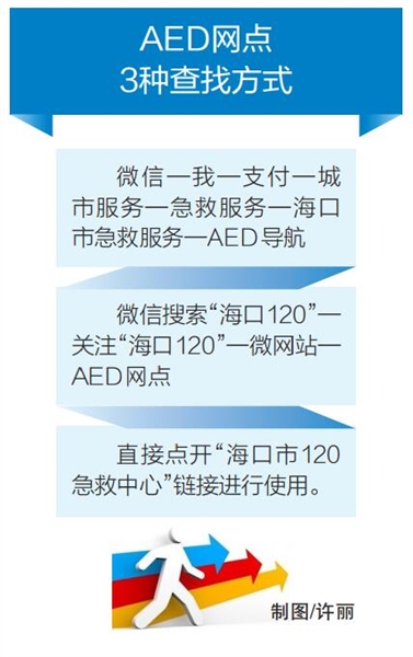 据悉,今年4月海口市在原有基础上又安装了250台AED,主要集中在大型商城、学校等人流密集的场所,以提高居民的互救能力。