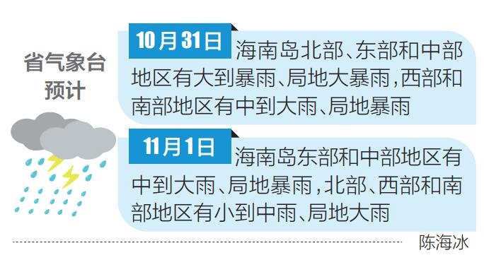 省气象局10月30日17时10分发布暴雨四级预警,受“麦德姆”和冷空气共同影响,预计30日夜间到31日白天,文昌、琼海、定安、屯昌、万宁、琼中等6个市县的大部分乡镇将出现50毫米以上的强降水。