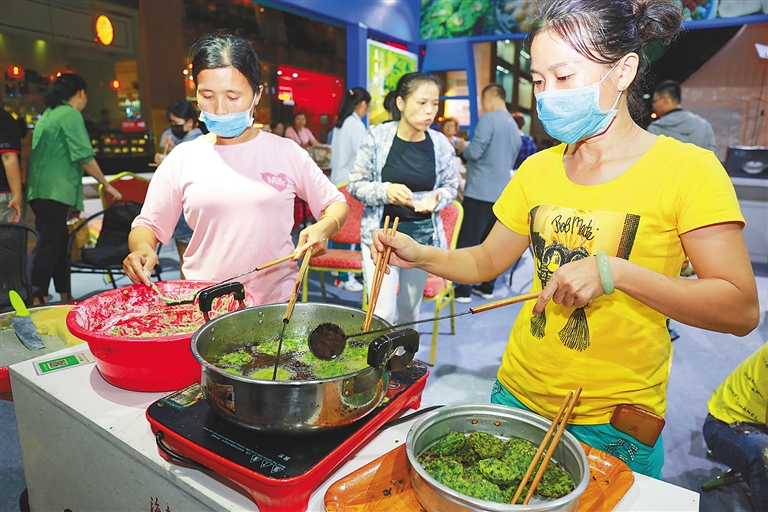 在2019第四届海南美食文化节临高馆现场,市民游客们可以品尝到正宗地道的油膏虾米韭菜饼、临高粉、临高年糕、尖堆等特色临高小吃。