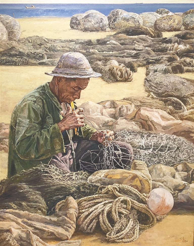 在海南中学校长马向阳的眼里,这既是一幅现代的渔舟唱晚图,又是现代版的《老人与海》。“大海是让人敬畏的,但老人好似经过一场激烈的风浪搏击,勇于创造生活,最后享受生活,比起满载而归的渔获,其内心的富足更让人羡慕!”马向阳说。同时,他还为此次画展激情赋词一首: