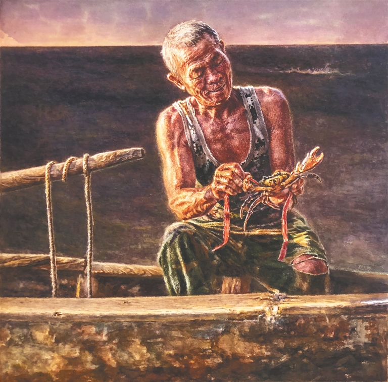 这是一个收获的傍晚。夕阳斜斜地照在渔船上,一位身着旧背心、裤腿被磨出窟窿的老渔民,正在细心地给刚捕获的大螃蟹绑带子。好似在与一场大风大浪搏击后,回归生活的本真,他享受此刻的宁静。——这是画家林先动的作品《南海渔翁二》,荣获2019年海南省庆祝中华人民共和国成立70周年美术水彩作品展金奖。