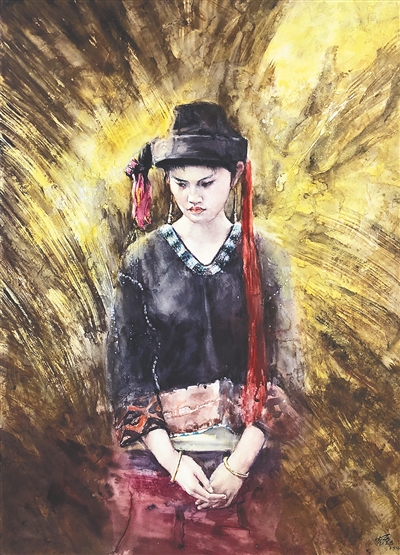 “创作《南海渔翁》这幅水彩画缘起我去临高县马袅湾偶遇的一位老渔民。他当时刚打完渔,脸上恬静幸福的表情一下子吸引了我。”林先动说,后来,他多次跑到同一地点去“蹲点”,甚至用无人机拍摄老渔民。“我在写实的基础上,采用层层叠加的画法,减少水分的用量,表现出沉重的沧桑感。这一画就是半年。”