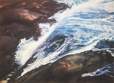 走进林先动的画作,发现他把画布当作旷野,在水彩碰撞、水墨交融间带我们走进了一个广阔无垠的世界,一个充满理想的诗意家园:海之号声如诺言般雄浑厚重、野菠萝生命力强劲向上张扬、木瓜树如父母亲般相互依偎低喃细语、大海时而魔幻时而宁静……