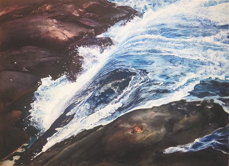 他的一幅关于文昌铜鼓岭月亮湾的作品《海天宇宙》,海浪冲击拍打着礁石,溅起朵朵浪花,刚硬与柔弱,磅礴与细语,这之间扑面而来的震撼如雄浑的交响乐共振心灵。