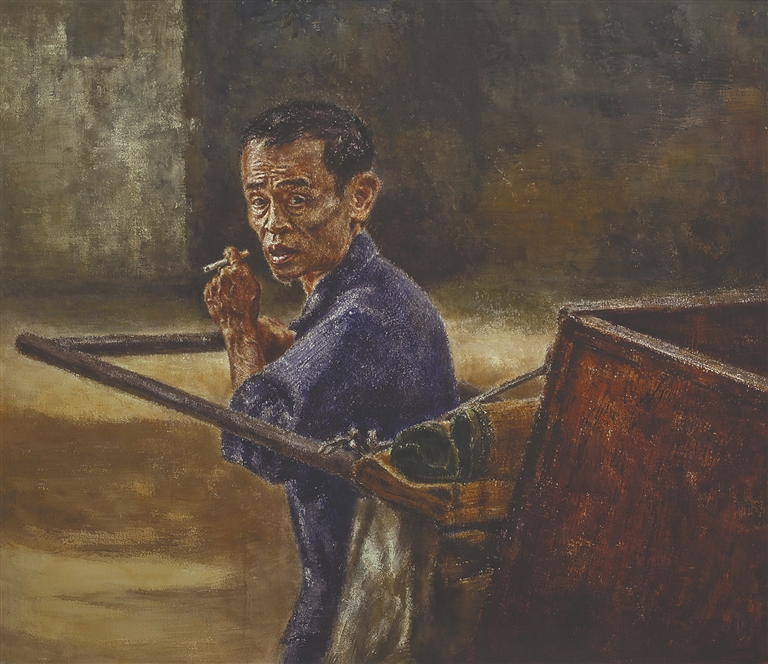 在现场,吸引众多观众的还有这幅《清洁工》。据林先动介绍,画中的清洁工人,是海南中学一位已故临时工,名叫苏文景,大家都亲切地喊他“阿景”。老人在校工作20多年,话不多,但勤勤恳恳地坚守着岗位。画中,约莫是一个寻常的午后,老人又从他宿舍门前拉着垃圾车经过,瘦小的身子差点被垃圾车盖过头。最让人触动的是,老人嘴里抽着烟,瞬间回眸的眼神里充满着倔强与善良。而这个悠闲的、能抽着烟干活的下午,也许是这位清洁工人理想生活的全部。