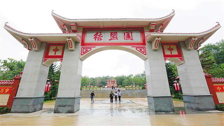 “歃血结盟后,黎族、苗族同胞在党的领导下,为建立五指山革命根据地,夺取抗日战争和解放战争的胜利作出了重大的贡献。”近日,在位于儋州和庆镇木排村的歃血结盟纪念园,纪念园相关负责人正向前来参观、游学的游客讲歃血结盟的故事。歃血结盟纪念园于今年2月开建,纪念园整合了木排革命根据地区域的革命遗址,包含了歃血结盟五人雕塑像、临儋联县委县政府纪念碑、琼崖纵队第四支队纪念碑、第一次会面旧址纪念碑、五角纪念亭、红军长廊、红军井等部分。其中,纪念园内一座《歃血结盟 永跟党走》纪念雕塑,是由我省著名雕塑家陈学博创作。他通过深入的历史考证和调研,生动刻画了马白山等2位党代表和3位黎族代表,手捧着鸡血酒宣誓结盟的庄严场景。