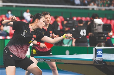 图为中国队选手丁宁(左)/陈梦在比赛中。最终,丁宁/陈梦以3:0战胜乌克兰队选手捷季扬娜/加娜。