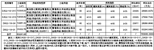 一、挂牌出让宗地基本情况和开发建设要求:(一)挂牌出让宗地基本情况:本次挂牌出让宗地位于三亚总部经济及中央商务区东岸单元控规DA02-18-01C、DA02-18-01D、DA02-19-04和DA02-19-01地块,CGCS2000国家大地坐标系总面积63291.06平方米(海南平面坐标系总面积63253.11平方米),用地四至及界址坐标详见地块勘测定界图。该宗地具体情况如下:1.控规DA02-18-01C地块,CGCS2000国家大地坐标系面积10354.05平方米(海南平面坐标系面积10347.88平方米),规划用地性质为服务型公寓混合零售商业用地(用地代码:B14/B11),零售商业与公寓用地兼容比例2:8,容积率≤3.5,建筑高度≤80米,建筑密度≤40%,绿地率≥35%。2.控规 DA02-18-01D地块,CGCS2000国家大地坐标系面积10939.90平方米(海南平面坐标系面积10933.31平方米),规划用地性质为服务型公寓混合零售商业用地(用地代码:B14/B11),零售商业与公寓用地兼容比例2:8,容积率≤3.5,建筑高度≤80米,建筑密度≤40%,绿地率≥35%。3.控规DA02-19-04地块,CGCS2000国家大地坐标系面积10061.35平方米(海南平面坐标系面积10055.29平方米),规划用地性质为服务型公寓混合零售商业用地(用地代码:B14/B11),零售商业与公寓用地兼容比例3:7,容积率≤3.5,建筑高度≤80米,建筑密度≤40%,绿地率≥35%。4.控规DA02-19-01地块,CGCS2000国家大地坐标系面积31935.76平方米(海南平面坐标系面积31916.63平方米),规划用地性质为其他商务混合零售商业用地(用地代码:B29/B11),零售商业与其他商务用地兼容比例4:6,容积率≤6.0,建筑高度≤200米,建筑密度≤45%(鉴于该地块将建设大型商业综合体,建筑密度可结合具体建筑设计方案进一步确定),绿地率≥25%。2019年9月5日,三亚市人民政府以《关于三亚市东岸单元(三亚总部经济及中央商务区)控规DA2-18-01C、DA2-18-01D等地块用地具备净地出让条件的证明》,证明三亚总部经济及中央商务区东岸单元控规DA02-18-01C、DA02-18-01D、DA02-19-04和DA02-19-01地块土地征收及"两公告一登记"工作已完成。三亚市吉阳区人民政府已与被征地单位签订了《征用土地补偿协议书》,土地补偿款、安置补助费、青苗补偿费和地上附着物等款项已支付到位,相关征地材料现存于吉阳区人民政府。目前地块上的附着物已清表、无法律经济纠纷、土地开发利用规划条件明确、符合土壤环境质量要求。地块周边可以满足施工建设所需的水、电供应,相关设备、机械可以进场施工。该宗地具备净地出让的条件。
