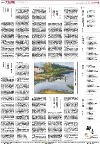 都说高手和智慧在民间,山柚油便一直有着种种的民间妙用:孕妇产妇服用进补,被称为“月子油”;跌打损伤外敷,活血消肿;涂抹在头发上有乌黑润发之效。这最后一招最得我心,在这华发已不算早生的人生阶段。傍晚,洗澡前,一时兴起,我打开山柚油瓶盖,黄澄澄的液体缓缓倒注于掌心,细腻温润,慢慢涂抹在头发上,脑子里自作多情地跑出那句, “长发为君留……”不过,最真实的感受是如我跟闺蜜嚷嚷的——“我觉得自己就像一块行走的白切鸡”。而在琼海清清万泉河边的农家乐,老同学就往我盛着山柚油盐巴的小碟里,夹了一块白切槟榔鸡——槟榔树下生长、吃槟榔果长大的鸡,而且是一块她自己通常也爱吃的翅膀。说起来,从小家里餐桌上的鸡翅膀都是我吃的,那会儿,母亲总笑着说, “专门吃翅膀,以后不知要飞多远……”