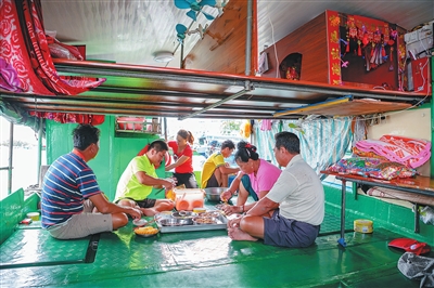 徐春苗的公公在年轻的时候是一名舵手,驾驶木船出海捕鱼,如今木船升级为玻璃钢船,掌舵的人也换成他的儿子。因为下午4时要出海,徐春苗2时多开始做晚饭,她的丈夫在甲板上洗澡,婆婆在洗衣服,公公修补渔网,一家人在船舱内外各自忙各自的活。