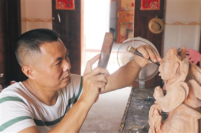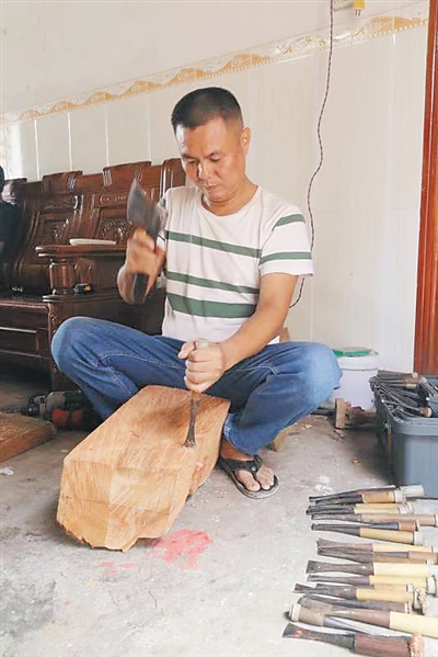 等到年龄稍长些,他开始奔走定安各地,拜师学艺,先后去岭口镇岭腰村王天照、龙门镇九温塘村郭家宏、龙河镇王世元等师傅家中求教。“学习手艺要从粗活干起,刚开始只能和粗笨的斧头刨子打交道。”谦虚好学的何平通过自己的努力,逐渐掌握了雕刻的门道。