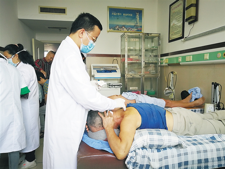 去年5月,上海交通大学医学院附属苏州九龙医院开始托管帮扶白沙县医院,让白沙县医院中医部的发展又上新台阶。以院长许金明为首的新一届领导班子统筹规划、整体布局,从中医部亚专科发展到人才梯队建设、设备和器械添置,着力发挥中医药特色在医院各临床学科中的渗透和结合,中医部已从单一的针灸科发展成为集中医临床、教学、科研于一体的一级临床特色专科,也是省内二级医院中少数能开展针刀治疗技术的特色专业科室。