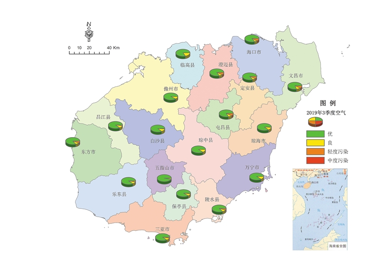 今年第三季度,全省空气质量总体优良,优良天数比例为96.1%,其中优占86.6%、良占9.5%,轻度污染占3.9%,无中度、重度和严重污染天。儋州、五指山、万宁、临高、琼中等5个市县优良天数比例为100%;其余13个市县(不含三沙市)优良天数比例为90.1%~98.9%;超标污染物主要为臭氧(O3)。与去年同期比较,全省空气质量优级天数比例下降6.1%,良级天数比例上升2.4%,轻度污染天数比例上升3.7%。