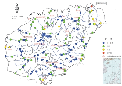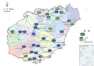 全省地表水环境质量总体为优,水质总体优良率为92.3%。开展监测的52条河流110个断面中,91.8%的监测断面水质符合或优于地表水Ⅲ类标准。其中,Ⅱ类水质断面占50.0%,Ⅲ类占41.8%,Ⅳ类占7.3%,劣Ⅴ类占0.9%。Ⅳ类水质主要分布在文教河和文昌河的入海河段、罗带河的入海河段、东山河的入海河口及三亚河的城市河段,劣Ⅴ类水质分布在珠溪河入海河口。