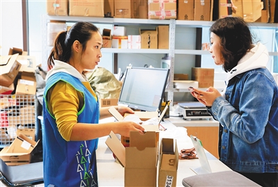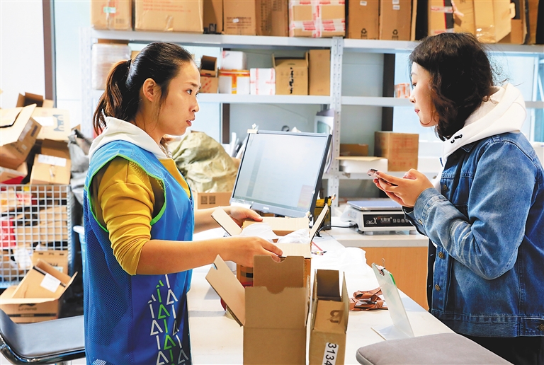 11月13日,位于上海交通大学闵行校区内的菜鸟驿站快递收发点迎来了“双11”购物节后的首个快递到达高峰。为了提高快递包装的循环使用率,菜鸟驿站在校园里推行“回箱计划”,回收快递纸箱并进行再次共享使用,受到师生欢迎。图为驿站寄件员(左)使用回收纸盒帮顾客包装需要快递的物品。新华社记者 方喆 摄