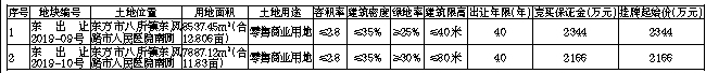 二、竞买事项:1、中华人民共和国境内外的法人和其他组织,除法律法规另有规定者外,均可参加竞买(注:失信被执行人不得参加本次竞买)。属境外机构(含港、澳、台地区)申请参与竞买的,按照规定需提交商务主管部门核发的《外商投资企业批准证书》和工商主管部门核发的《营业执照》。本次挂牌出让地块不接受联合竞买;必须在挂牌出让公告规定的时间内把竞买保证金存入东方市自然资源和规划局指定账户(以挂牌竞买保证金入账户时间为准)。2、本次国有建设用地使用权挂牌出让设有底价,按照价高且不低于底价者得的原则确定竞得人。3、本次挂牌出让宗地的详细资料和具体要求(详见挂牌出让文件)。申请人可于2019年11月18日8:30至2019年12月13日16:00到东方市自然资源和规划局办公楼三楼权益和开发岗(或海南省公共资源交易服务中心一楼受理大厅3号窗口)咨询和购取挂牌出让手册,并按挂牌出让手册的具体要求报名参加竞买。4、交纳竞买保证金的截止时间为2019年12月13日16:00(北京时间)。经审核,申请人按规定交纳竞买保证金,具备申请条件的,我局将在2019年12月13日17:00(北京时间)前确认其竞买资格。5、挂牌地点:海南省政府会展楼二楼省公共资源交易中心土地交易厅。6、挂牌始起时间:2019年12月6日8:30(北京时间);挂牌截止时间:2019年12月17日16:00(北京时间);挂牌现场会时间:①东出让2019-09号:2019年12月17日16:00(北京时间);②东出让2019-10号:2019年12月17日16:30(北京时间)。7、挂牌时间截止时,有竞买人表示愿意继续竞价的,转入现场竞价,通过现场竞价确定竞得人。8、本次挂牌出让不接受电话、邮寄、电子、口头等其他方式报价。三、宗地开发建设要求:该宗地若实施装配式建筑,应按装配式建筑有关规定执行。四、其他事项:1、确定竞得人后,竞得人与东方市自然资源和规划局当场签订《挂牌出让成交确认书》,并在30日内签订《国有建设用地使用权出让合同》,按照合同约定支付土地出让金,依法申请办理土地登记。2、土地出让金按《国有建设用地使用权出让合同》的约定支付,合同约定一次性缴纳土地出让金的,应从合同生效之日起90日内付清土地出让金;合同约定分期缴纳土地出让金的,分期缴纳全部土地出让金的期限不得超过1年,首次缴纳比例不得低于全部土地出让金的50%。逾期未付清土地出让金的,土地行政主管部门有权依法解除合同,并由受让人承担相应的违约责任。竞得人缴纳的竞买保证金自动转做出让地块的出让金。挂牌出让金不含各种税费。3、挂牌的地块以现状土地条件出让。本次挂牌出让事项如有变更,以届时变更公告为准。4、本公告未尽事宜详见《东方市国有建设用地使用权挂牌出让手册》,该手册所载内容为本公告的组成部分。联系人: 陆先生 蒙先生;联系电话:0898-25582051、65203602;地址:东方市二环南路4号东方市自然资源和规划局;查询网址:http://zw.hainan.gov.cn/ggzy/;www.landchina.com