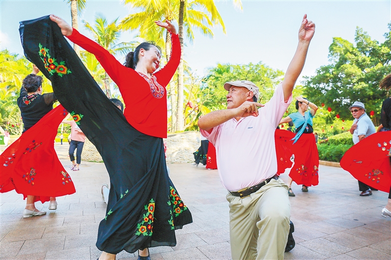 11月13日,在三亚海月广场,“候鸟”老人跳起健身舞。 本报记者 武威 摄