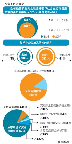 精准服务和保障民生。1月至10月,全省检察机关对制售有毒有害食品、假药劣药等犯罪,批捕59人,起诉21人;对校园欺凌暴力犯罪,批捕13人,起诉9人;对侵害农村留守儿童合法权益犯罪,批捕27人,起诉7人;对侵害老年人合法权益犯罪,批捕100人,起诉428人;对侵害残疾人合法权益犯罪,批捕20人,起诉28人;对强奸、拐卖、强制猥亵、强迫卖淫等侵害妇女人身权益犯罪,批捕218人,起诉155人;对侵害进城务工农民合法权益犯罪,批捕64人,起诉94人;对拒不支付劳动报酬犯罪,批捕14人,起诉26人。共批准逮捕破坏环境资源类犯罪439人,起诉525人,同比分别上升2.3倍、12.2%。