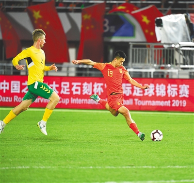 11月17日,在重庆举行的2019CFA中国之队·“大足石刻杯”国际足球锦标赛中,中国U22国家男子足球队主场以1比0战胜立陶宛U22国家男子足球队。图为中国队球员黄聪(右)在比赛中射门。 新华社发(黄伟 摄)