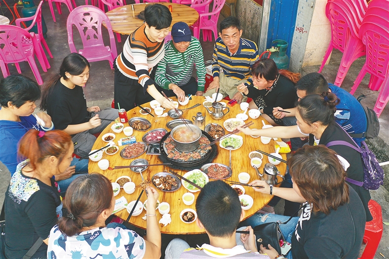 几乎每天晚上,仙沟车来车往络绎不绝,不少食客从海口、琼海、三亚等地慕名而来,围桌而聚,到仙沟吃牛肉几乎成了食客们的一种新时尚。夜色下,友朋欢笑间,店家热情地摆上子母锅,子锅中煮的是牛骨高汤,涮着鲜嫩清香的现杀仙沟牛肉。母锅上则铺上了烧烤纸,涂上一层浓香的花生油,将腌制过的牛肉放在锅上煎烤,短短几秒,新鲜的牛肉便散发出令人垂涎的香味。觥筹交错之间,食客们流连于美食牛宴,在煎烤涮煮之中,找寻关于牛肉的美味真谛,至于返程时间,他们似乎已经忘却。