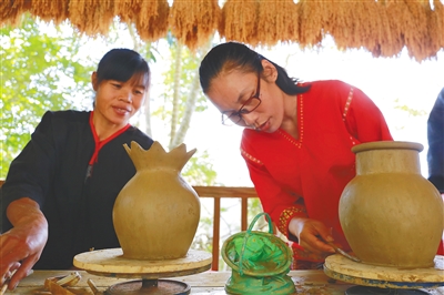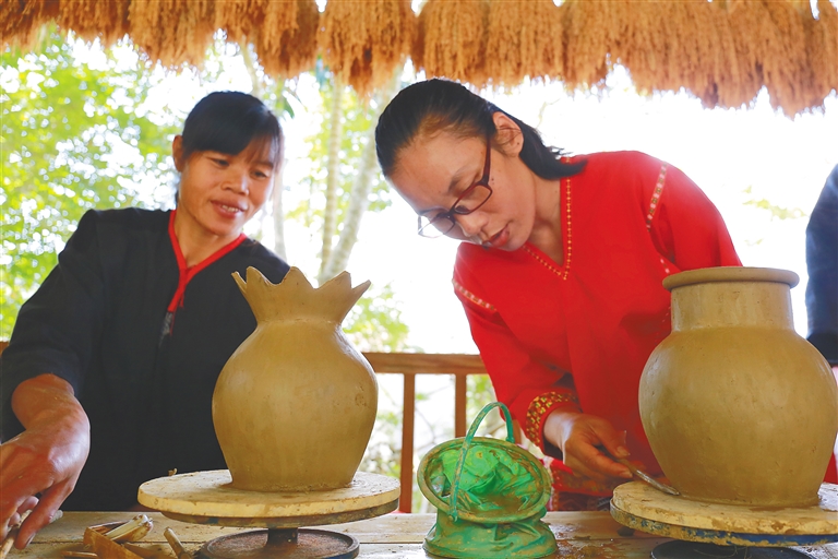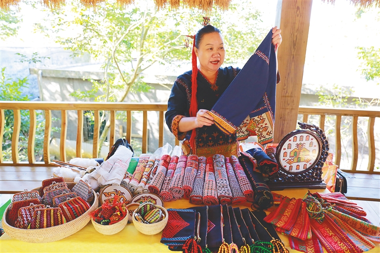当天,在开幕式主会场,活动主办方还设置了“茶·陶”“锦·绣”“竹·藤”等非遗技艺展销区,将黎族原始的制陶技艺融入现代生活元素,“变身”灯罩、花瓶等文创味十足的实用品;一针一线、一推一拉之间,精美的黎锦图案逐渐跃然眼前,且不止于衣裳、头巾,还延伸至现代生活的化妆袋、手提包,非遗艺人的匠心传承,也连起了绵延不断的民族文化。