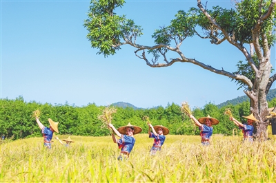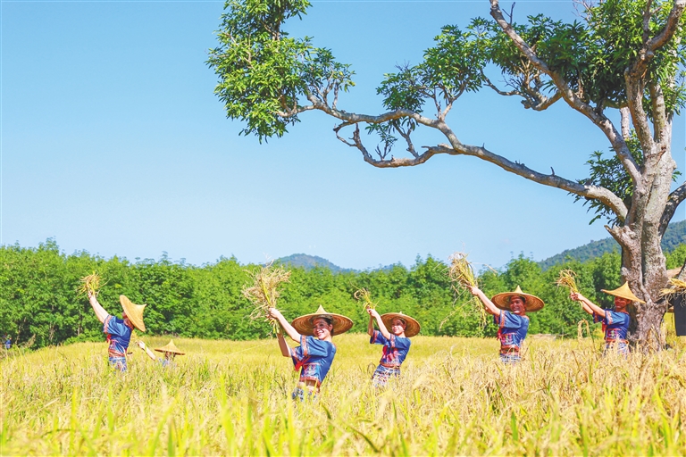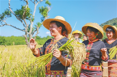 当天,半山腰处的山兰稻园里,活动主办方沿袭当地习俗,举办了祭拜山神、“稻公”喊山、“稻婆”祈福等仪式;随后,《稻上金秋》劳作歌舞实景演出将黎族源远流长的山兰农耕文化逐一呈现;紧接着,竹木器乐《黎乐传情》《黎寨欢歌》演奏、群舞《种山栏》等一系列精彩节目轮番上演,让远道而来的宾客感受到了黎族民俗文化的独特魅力。为增加活动的体验性,活动主办方还安排宾客在山兰稻田里体验收割、捆稻等劳作,切身感受黎族同胞的种植辛劳与丰收喜悦。