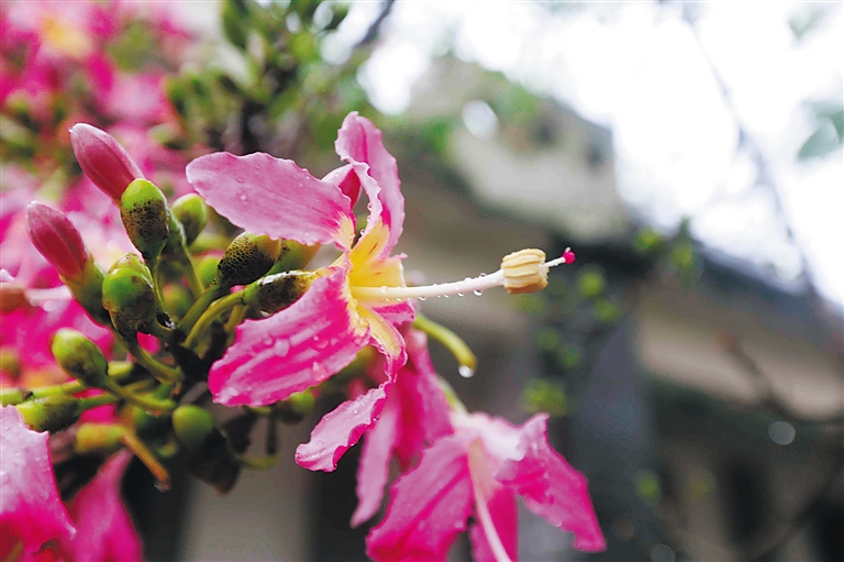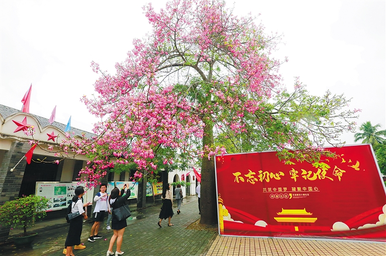 近日,在儋州市那大镇石屋村中国村官精神馆前,一株木棉花开得正艳,成了石屋村初冬的一道特色风景。