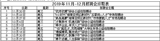 由海口市人力资源开发局全新打造的就业超市——海口市人力资源市场开业啦!现定于 2019年11月—12月每周一、三、五上午9:00-12:00举办公益性常规招聘会。