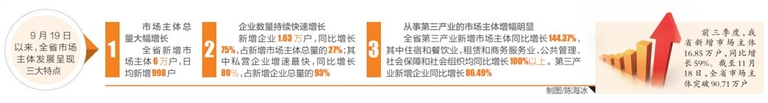 前三季度,我省新增市场主体16.85万户,同比增长59%。截至11月18日,全省市场主体突破90.71万户。其中,企业30.47万户,占全省市场主体总量的33.58%(私营企业25.19万户,占企业总量的82.66%;外资企业0.35万户,占企业总量的1.16%);个体工商户60.24万户,占全省市场主体总量的66.41%。