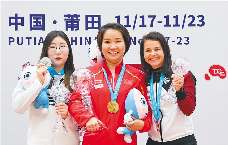 11月20日,冠军中国选手张靖婧(中)、亚军韩国选手金敏贞(左)和季军德国选手莫尼卡·卡什在颁奖仪式上。