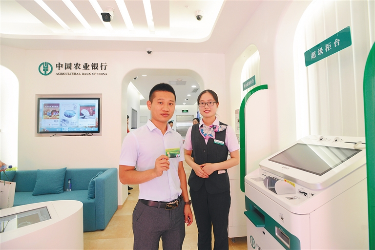再往里走,就能看到一台台智能柜台整齐排列,这里是农行三沙分行5G网点的智能服务区。ATM实现刷脸取款,超过95%的传统业务可以通过农行超级柜台办理完成,即使没有工作人员的引导,客户也能根据系统提示,轻松完成现金、非现金存单、存折票据等业务。