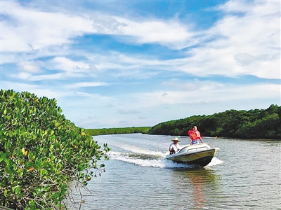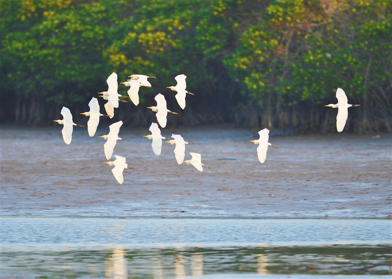 碧水粼粼,映着郁郁葱葱的红树林,天地间氤氲的水雾让初冬的海口东寨港恍如仙境。忽而,一阵翅膀的扑棱声传来,成群的白鹭从远处的林间直冲云霄。