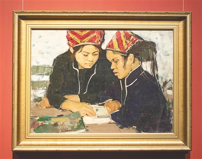 “哎这不是我们黎族的服饰吗?”小沈惊喜地呼唤同学前来观看罗工柳的画作《学文化》和胡善余的画作《黎族歌手》。前者作品中,两名黎族少女正俯在桌前学习。在后者作品中,黎族男歌手身着绿色传统服饰,目视远方,充满憧憬,面部刻画较为写实,而服饰则更为写意,虚实结合,为作品平添了一分生动。“两幅画都有实有虚,对于人物神情的把握精细入微,表现了人民积极向上的精神面貌。”小沈解读道。