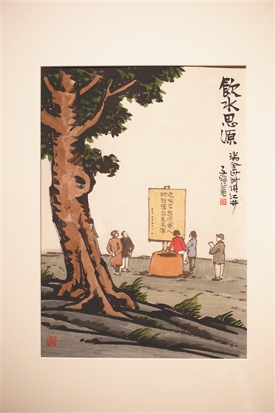 《饮水思源》是丰子恺的代表作之一。1933年4月,在瑞金沙洲坝,毛主席带领百姓挖了一口井,解决了百姓吃水难的问题。百姓感念毛主席的恩情,就在井旁立了一块石碑,并刻上“吃水不忘挖井人,时刻想念毛主席”。1961年,丰子恺创作该画作,画中三代人参观“红井”,寓意红色基因代代相传、革命精神发扬光大。